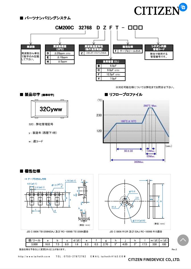| CMR200T32768DZFT | CITIZEN晶體 | 32.768kHz | ±20ppm | 12.5pF | 50 kOhm | -40°C ~ 85°C |