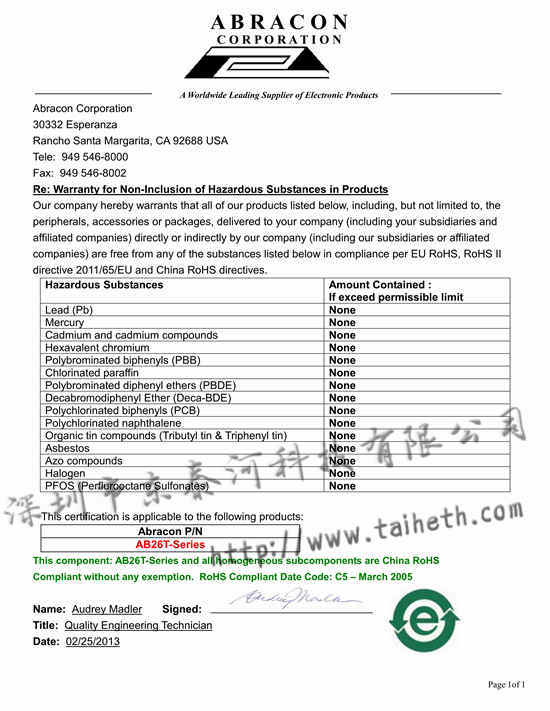 - [2019-04-30]AB26T晶振ROHS報(bào)告