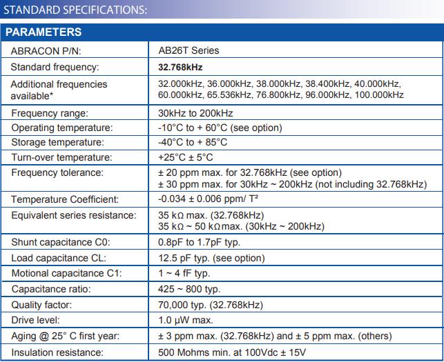 AB26T晶振常用頻率為32.768KHZ,也可以做32.000kHz, 36.000kHz, 38.000kHz, 38.400kHz, 40.000kHz, 60.000kHz, 65.536kHz, 76.800kHz, 96.000kHz, 100.000kHz等頻率,最高可達(dá)200KHZ。有需要的朋友可以來電咨詢訂做:0755-27872782,或者是直接進(jìn)入晶振官網(wǎng)與我們聯(lián)系:http://m.cuifesek.cn