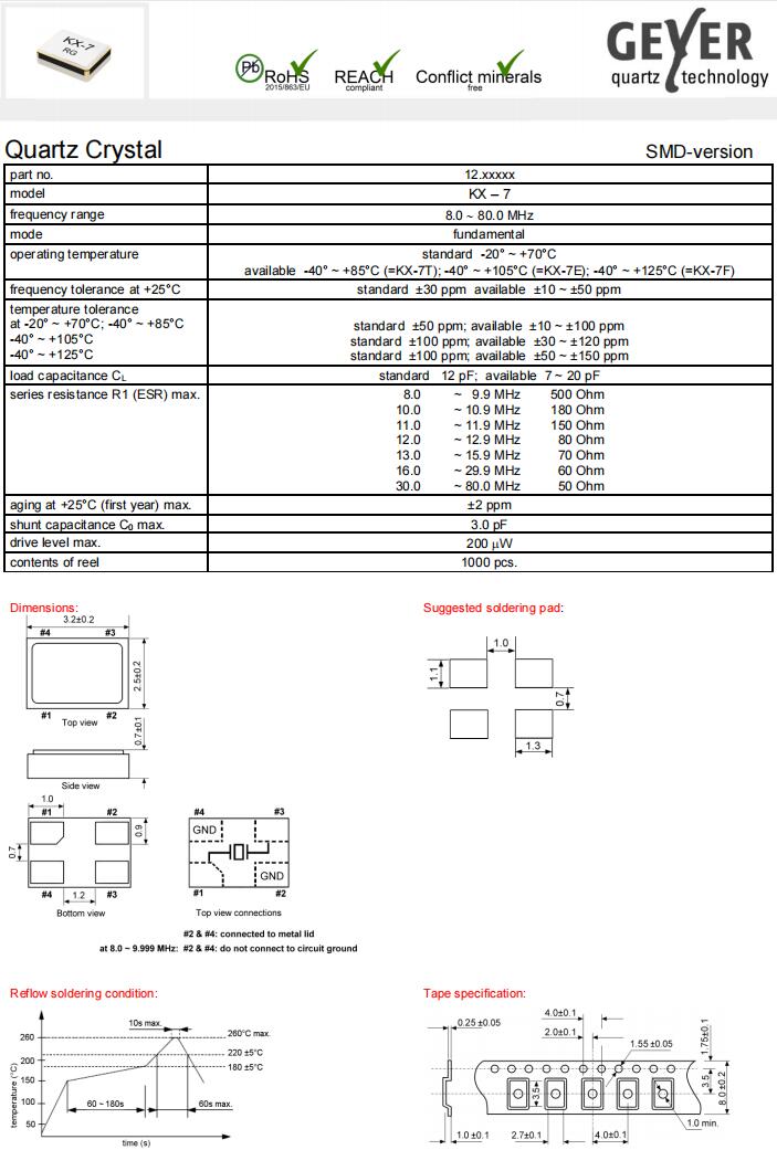 12.60095|12MHz|12pF|格耶耐高溫晶振,歐美進口晶振,格耶晶振,KX-7F無源晶振,石英晶振,12.60095晶振,晶體諧振器,3225mm晶振,四腳貼片晶振,SMD晶體,頻率12MHz,負載12pF,頻率容差20ppm,工作溫度-40~125°C,耐高溫晶振,高可靠性晶振,無鉛環保晶振,無線電收發機晶振,數字式攝像機存儲晶振,監控攝像頭晶振,家庭醫療保健晶振.