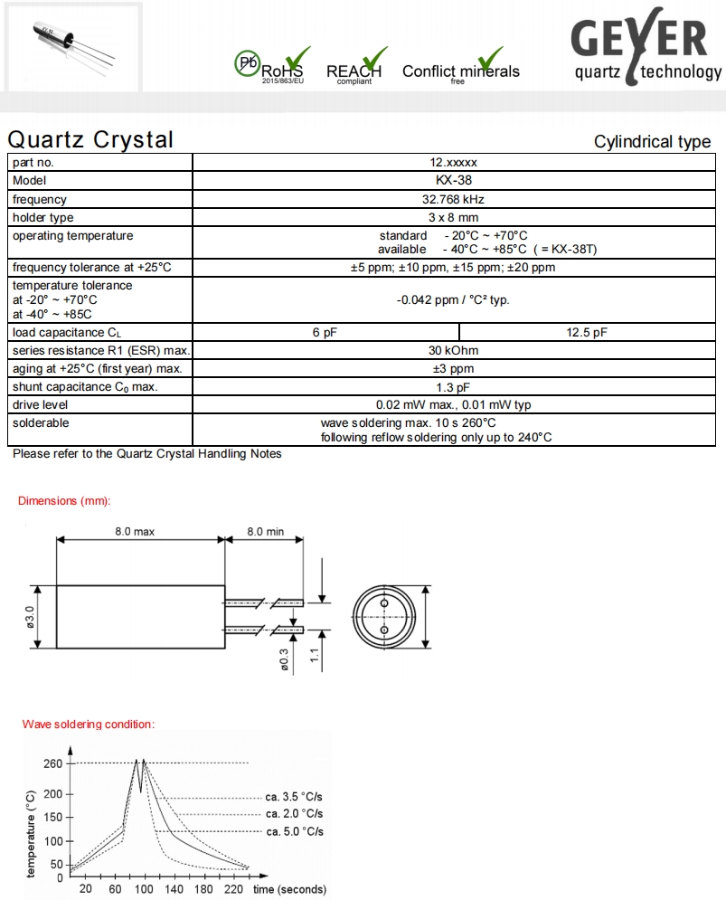12.80105|32.768KHz|7pF|Geyer Crystal,Geyer Crystal,KX-38無源晶振,進口晶振,12.80105晶振,石英晶體諧振器,圓柱晶振,308mm晶振,二腳插件晶振,頻率32.768KHz,負載7pF,頻率容差20ppm,工作溫度-20~70°C,高可靠性晶振,無鉛環保晶振,低老化晶振,通訊設備晶振,網絡服務器晶振,存儲器晶振,音頻系統晶振.