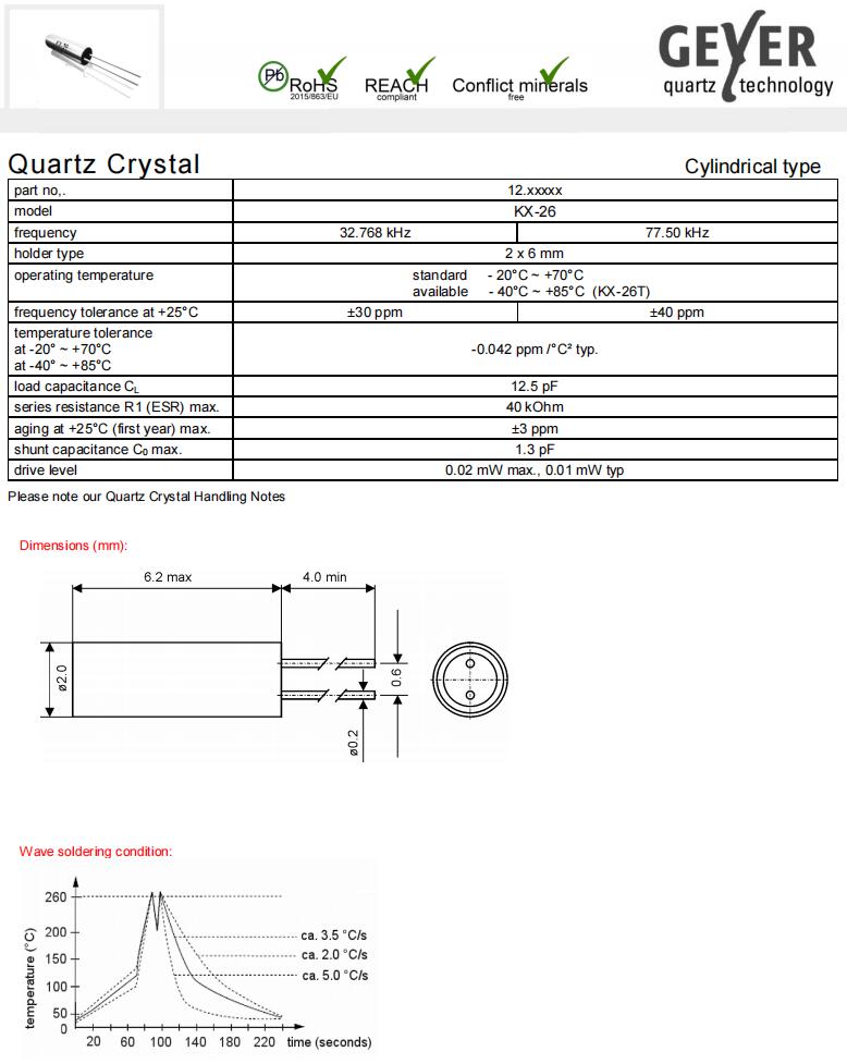12.80116|32.768KHz|12.5pF|GEYER晶振,GEYER晶振,KX-26無(wú)源晶振,圓柱晶振,12.80116晶振,進(jìn)口石英晶振,晶體諧振器,二腳插件晶振,2.0*6.0mm晶振,頻率32.768KHz,負(fù)載12.5pF,頻率容差20ppm,工作溫度-20~70°C,高可靠性晶振,高質(zhì)量晶振,小體積晶振,兒童學(xué)習(xí)產(chǎn)品晶振,智能手表晶振,平板電腦晶振,DVD家電影音系統(tǒng)晶振.