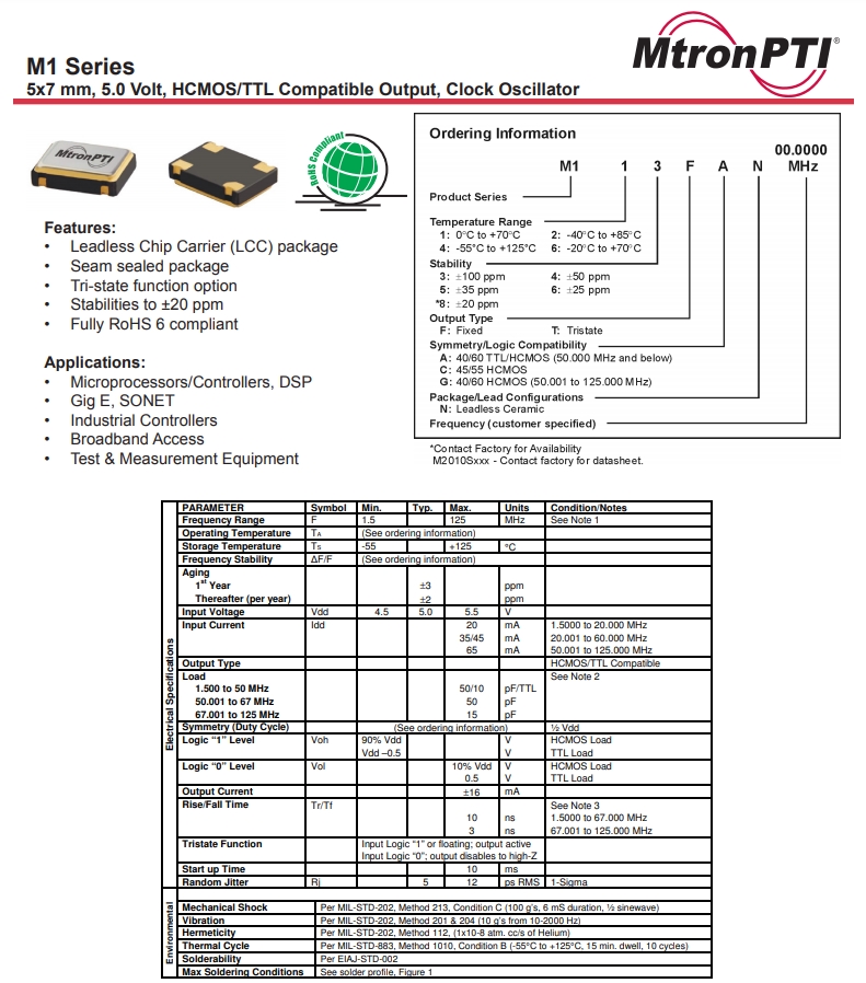 | 60551-43N 16.384000 | M2 | ±100 ppm | 16.384 | 5.0 x 7.0 mm | -55°C to +125°C | 3.3 |