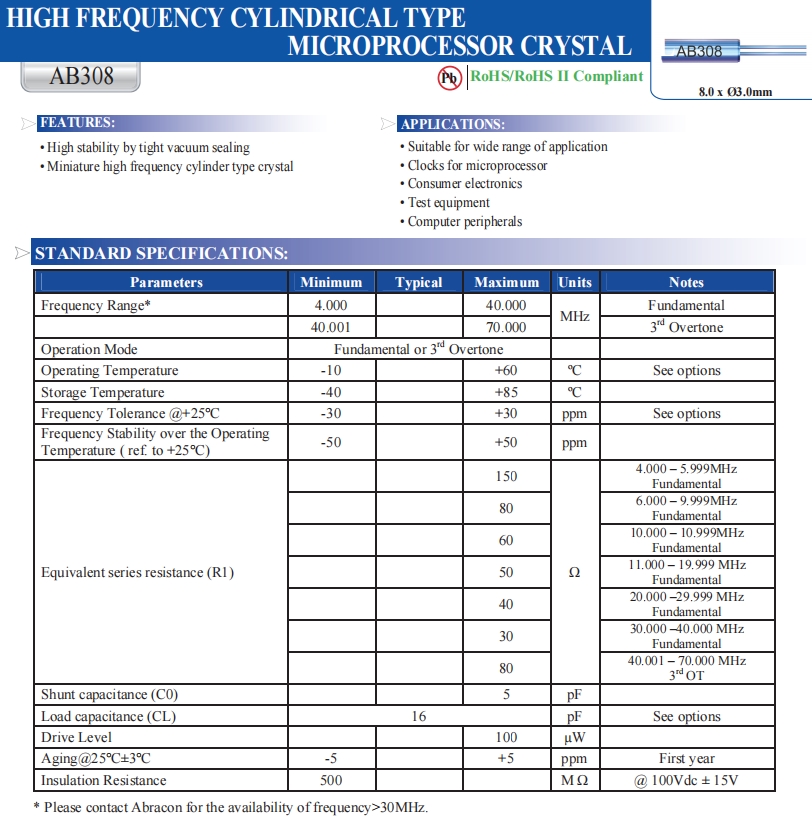 | AB308-14.31818MHZ | Abracon晶振 | AB308 | MHz Crystal | 14.31818MHz |