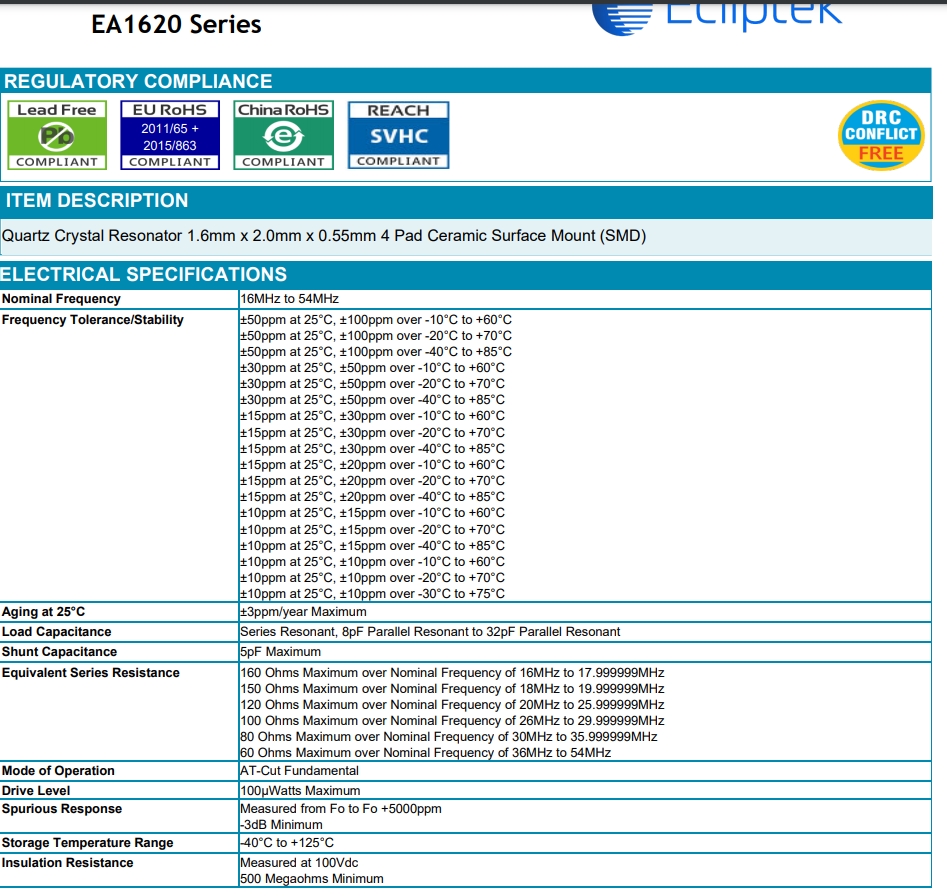 | EA1620LA10-20.000M | 表面貼裝晶體諧振器 | Crystal Resonator 20MHz ±15ppm (Tol) ±20ppm (Stability) 10pF FUND 120Ohm 4-Pin CSMD Bulk | -20~70 |