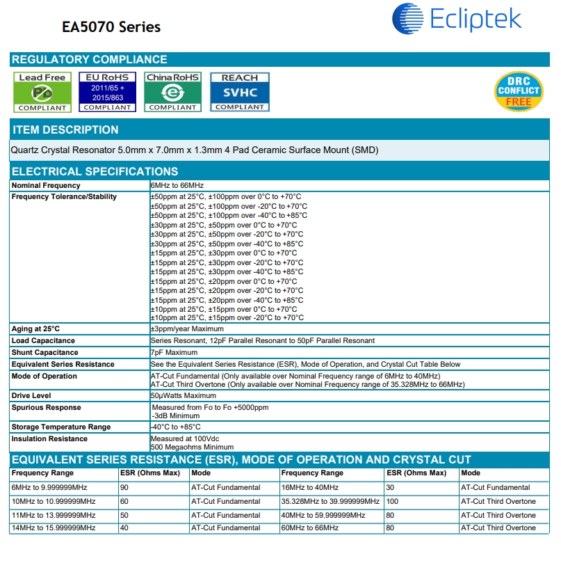 EA5070CA12-24.000M TR|EA5070晶振|貼片晶振|ECLIPTEK晶振,物料編碼EA5070CA12-24.000M TR,型號EA5070,頻率24MHZ,精度±100ppm,負載電容12PF, 尺寸:7.0*5.0.1.5mm,溫度范圍:-40℃-85℃,貼片晶振,晶振,無源晶振,石英晶振,ECLIPTEK晶振,晶振廠家,石英晶體諧振器,應用于4G無線網,5G無線網,6G無線網,移動電源,機頂盒,打印機,抽煙機.