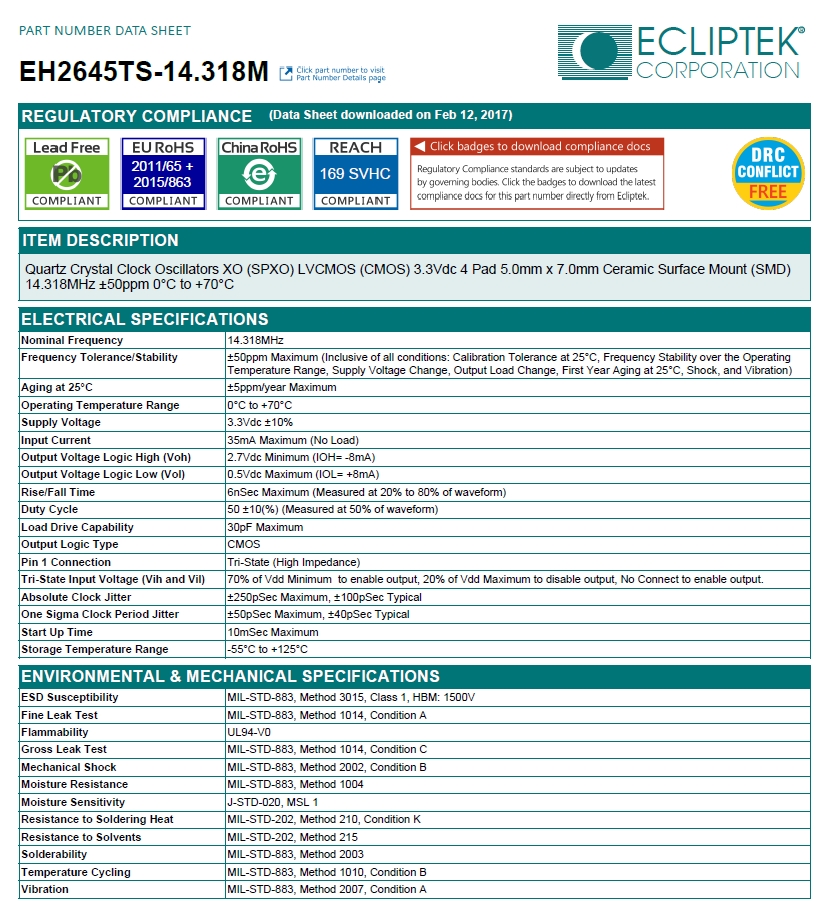 | EH2520TS-4.194304M | Ecliptek | 表面貼裝晶體振蕩器 | Quartz Crystal Clock Oscillators XO (SPXO) HCMOS/TTL (CMOS) 5.0Vdc 4 Pad 5.0mm x 7.0mm Ceramic Surface Mount (SMD) 4.194304MHz ±20ppm over 0°C to +70°C | Crystal Oscillator | 0~70 |