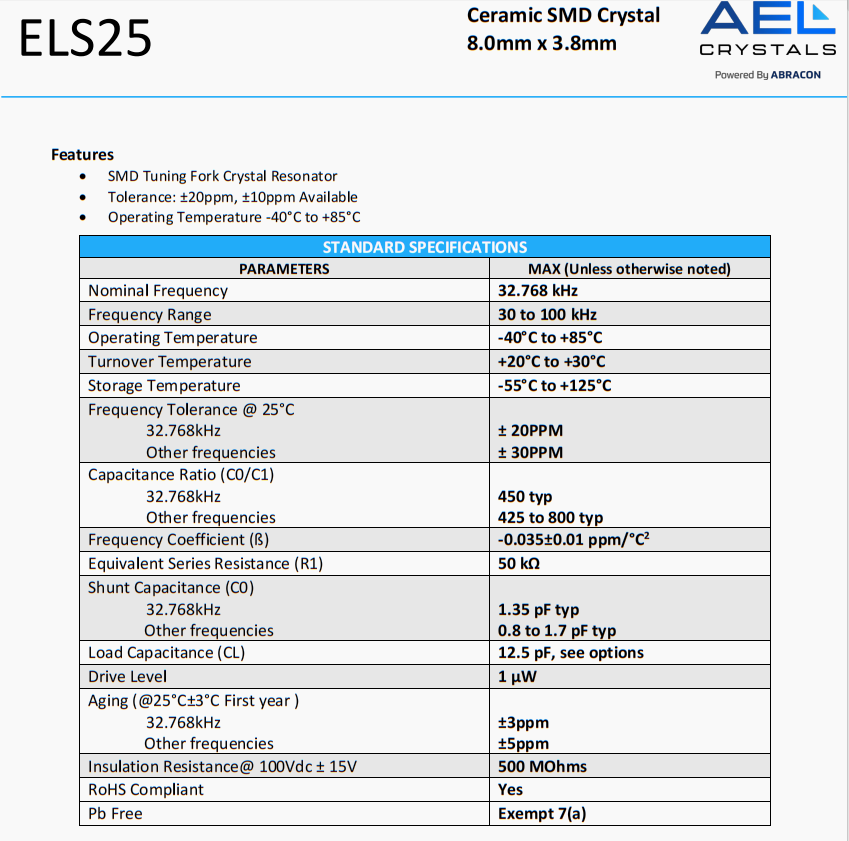 | ELS25-32.768kHz-T | AEL晶振 | ELS25 | 32.768 kHz | ±20ppm | 12.5 pF |