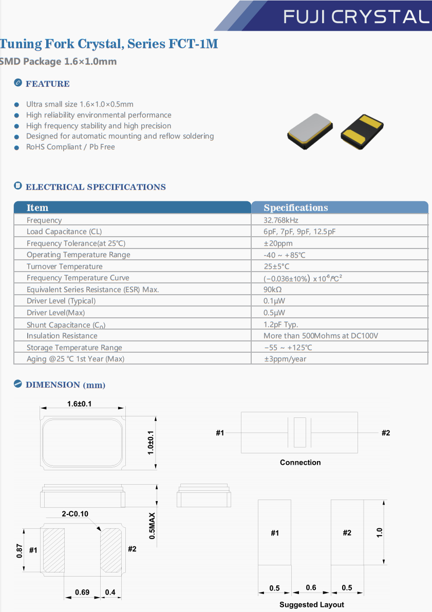 | FCT1M032768C5P1 | Fuji晶振 | FCT-1M | 32.768 kHz | - | - | 12.5pF | -10°C ~ 60°C |