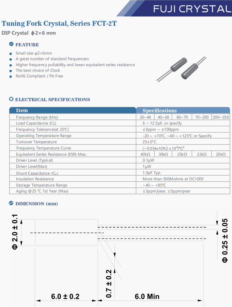 日本富士晶振,FCT2T03276809P3圓柱晶振,領(lǐng)先全球的6G路由器晶振,日本富士晶振,F(xiàn)uji晶振,6G通訊終端晶振,高精度晶振,圓柱晶振,2*6晶振,石英晶振,二腳晶振,無(wú)源晶振,KHz晶振,插件晶振,6G通訊專用晶振,6G路由i去晶振,高品質(zhì)晶振,F(xiàn)CT-2T晶振,小尺寸φ2×6mm,大量的標(biāo)準(zhǔn)頻率,更高的頻率可拉性和更低的等效串聯(lián)電阻,鐘表的最佳選擇,符合RoHS標(biāo)準(zhǔn)/無(wú)鉛