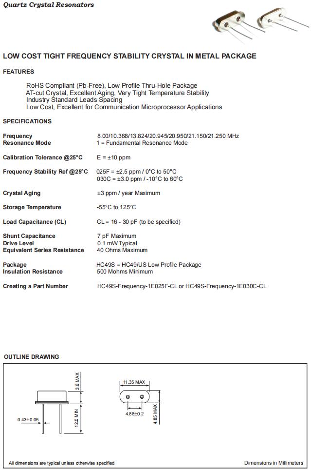 HC49S-10.368-1E030C-16|10.368MHz|16pF|Fortiming晶振,Fortiming晶振,歐美進口晶振,HC49S無源晶振,兩腳插件晶振,HC49S-10.368-1E030C-16晶振,石英晶體諧振器,低輪廓通孔封裝晶振,AT切割晶體,行業標準引線間距,11.35*4.85mm晶振,頻率10.368MHz,負載16pF,頻率容差10ppm,工作溫度-10~60°C,低成本晶振,高穩定性晶振,無鉛環保晶振,微處理器晶振,通訊設備晶振,電信交換機晶振,低姿態應用晶振.