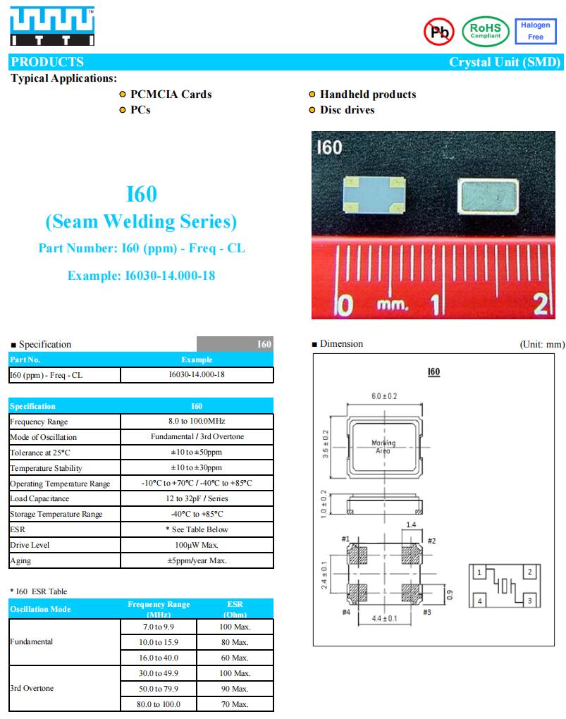 ITTI Crystal,6035mm晶振,I6020-52.000-16,6G個人通信晶振規格表