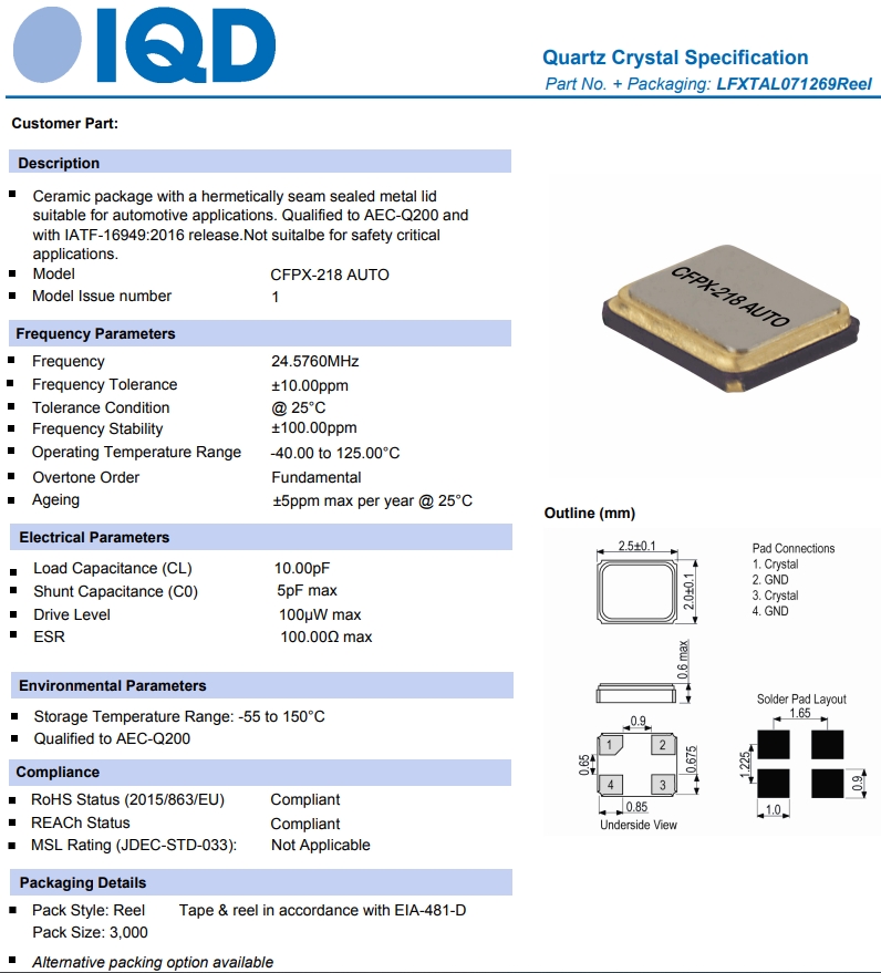 LFXTAL071269REEL|Resonator Crystal,IQD晶振,CFPX-218無源晶振,LFXTAL071269REEL晶振,石英晶體諧振器,2520貼片晶振,進口石英晶振,SMD晶體,頻率24.576MHz,負載10pF,頻率容差10ppm,工作溫度-40~125°C,耐高溫晶振,抗沖擊晶振,輕薄小晶振,信息娛樂系統晶振,高級駕駛輔助系統晶振,GPS導航晶振,汽車音響控制器晶振.