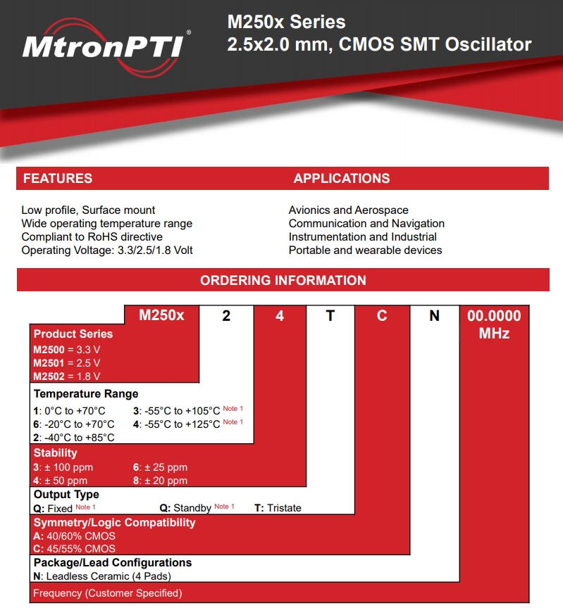 | M250026TCN 28.636300 | M250x | ±25 ppm | 28.6363 | 2.5 X 2.0 mm | -40°C to +85°C | 3.3 |
