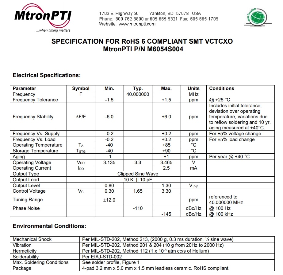 | M6054S005 40.000000 | M6053 and M6054 | ±0.5 ppm | 40 | 3.2 X 5.0 mm | -30°C - +85°C | 2.8 |
