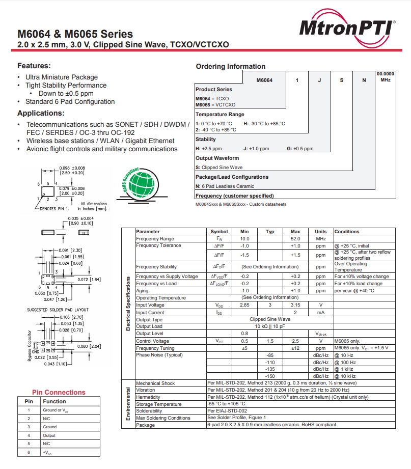 | M6064S021 32.000000 | M6064 and M6065 | ±2.5 ppm | 32 | 2.5 X 2.0 mm | -40°C to +85°C | 3 |