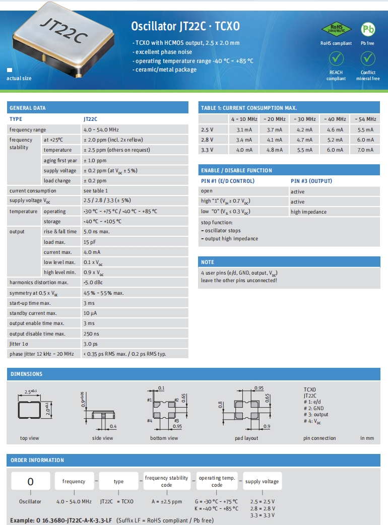 | Q 20.0-JXS22-12-10/10-FU-WA-LF | Jauch晶振 | JXS22-WA | 20MHz | ±10ppm | 12pF | -20°C ~ 70°C |