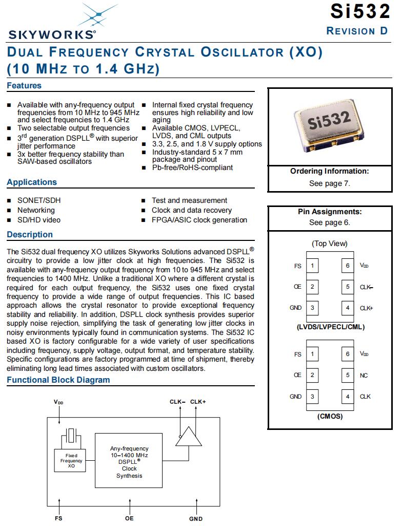 | 531BB62M5000DGR | Skyworks Solutions Inc. | Si531 | 62.5 MHz | LVDS | 3.3V |