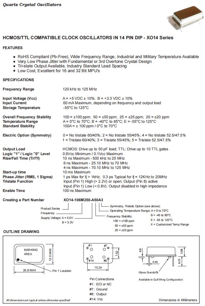 XO14-106M250-A50E3|106.25MHz|5V|富通長方形鐘振,歐美進口晶振,富通晶振,XO14長方形鐘振,有源晶振,XO14-106M250-A50E3晶振,石英晶體振蕩器,四腳插件晶振,20.8×13.0mm晶振,頻率106.25MHz,電壓5V,頻率容差50ppm,工作溫度-55~125°C,符合RoHS標準,低相位抖動晶振,低成本晶振,微處理器晶振,移動應用晶振,工業自動化晶振,測試與測量設備晶振.