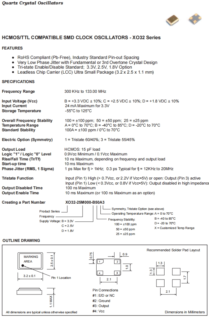 XO32-24M000-B25B3|24MHz|3.3V|Fortiming Crystal,歐美進口晶振,Fortiming Crystal,XO32有源晶振,石英晶體振蕩器,XO32-24M000-B25B3晶振,3225貼片晶振,四腳封裝晶振,頻率24MHz,電壓3.3V,頻率穩定性25ppm,工作溫度-40~85°C,高精度晶振,小體積晶振,無鉛環保晶振,網絡附屬存儲晶振,固態硬盤晶振,工業控制器晶振,戶外電子產品晶振.