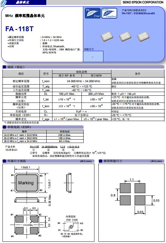 | X1E0002510126 | 1.6 x 1.2 x 0.35mm | FA-118T | 24.000000 MHz | 7 pF | +/-30 ppm | -20 to +75 °C |