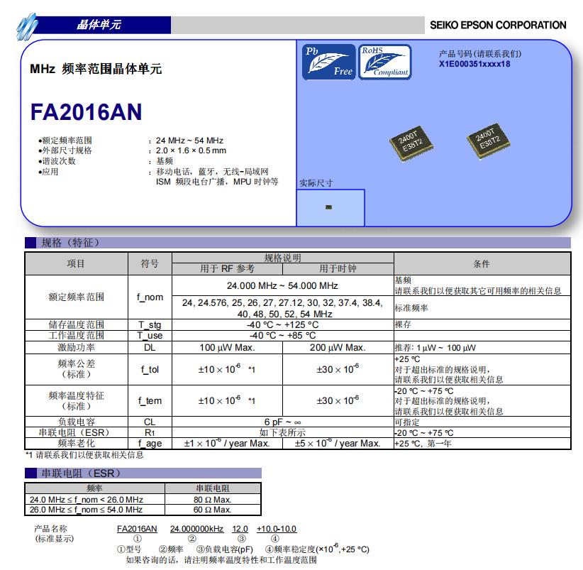 FA2016AN-X1E0003510024-38.4MHZ-8pF-MPU時鐘,尺寸為2016mm,頻率為38.4MHZ,頻率穩定度為10ppm,負載電容8pF,工作溫度-20°C~75°C,日本愛普生晶振,進口晶振,無源貼片晶振,石英晶體,水晶振動子,石英晶體諧振器,音叉晶體,2016mm無源晶振,進口無源晶振,SMD晶振,低損耗晶振,高品質晶振,38.4MHZ晶振,移動電話專用晶振,藍牙晶振,無線設備晶振,MPU時鐘晶振,儀器儀器晶振,數碼電子晶振,X1E0003510025石英晶振,X1E0003510019貼片晶振。