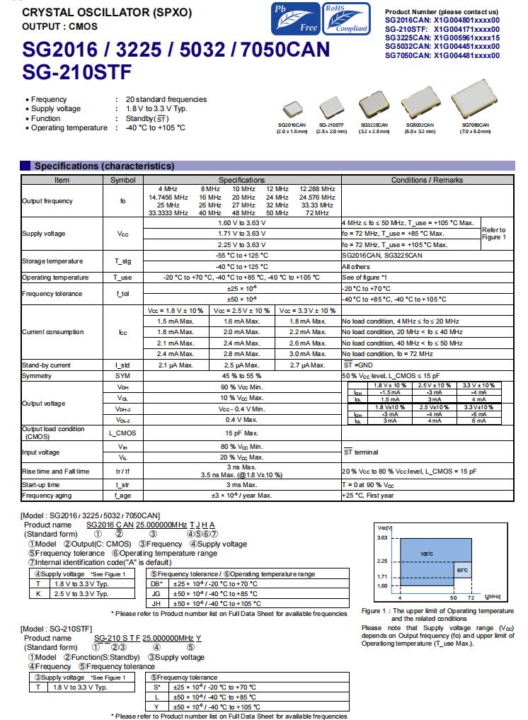 | X1G0044510026 | 愛普生有源晶振 | SG5032CAN | 25.000000 MHz | 5.00 x 3.20 x 1.30 mm | CMOS | 1.600 to 3.630 V | -40 to 105 °C | +/-100 ppm |