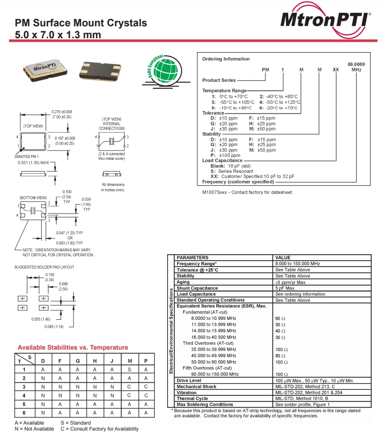 | PM4GM 25.000000 | PM series | ±50 ppm | 25 | 5.0 x 7.0 mm | -55°C to +125°C | 18 pF |