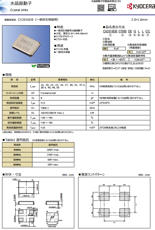 | CX2016DB27000D0FLJC1 | AVX Corp/Kyocera Corp | CX2016DB, Kyocera | MHz Crystal | 27MHz | -30°C ~ 85°C |