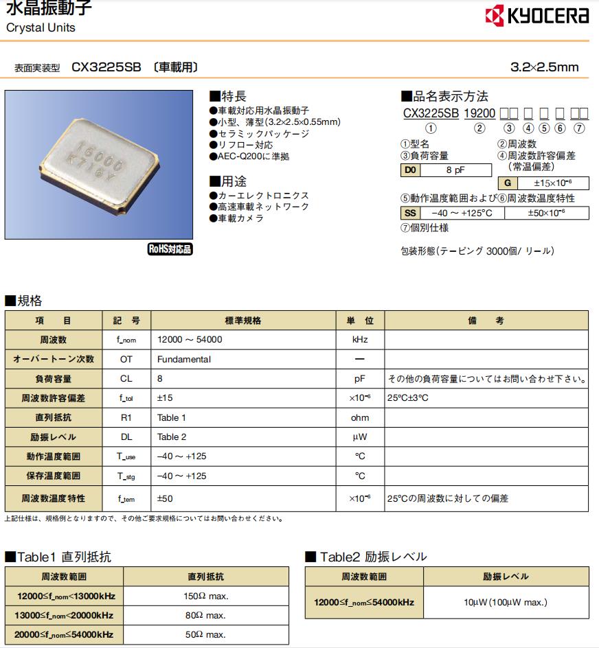 CX3225SB12000H0FLJCC,12MHZ,Kyocer,車載攝像機,SMD 參數表