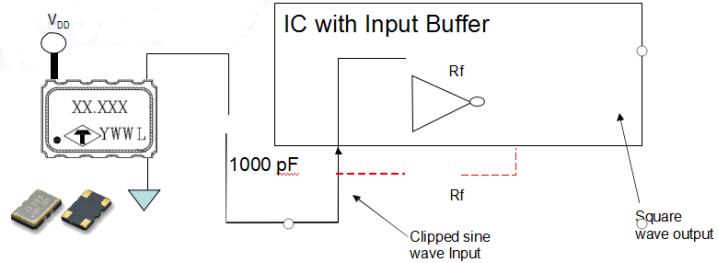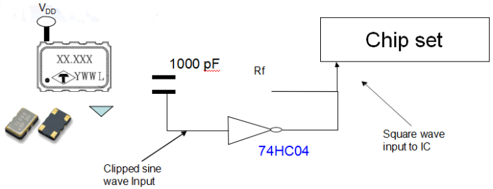 •If the IC does not have input buffer functionality incorporated, an inverter such as 74HC04 and an Rf resistor would need to be added in series between the output pin of the TCXO and the clock input pin of the IC to convert the clipped sine waveform to a square waveform