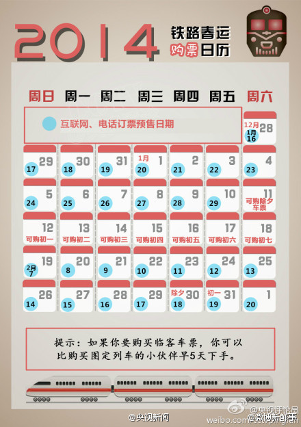 圣誕節(jié)來啦,不管是國(guó)外的節(jié)日也好,不管說我們崇洋媚外也好,總之借一借外國(guó)人的喜慶日子大家也happy一下。祝大家圣誕節(jié)快樂,心想事成,生意興隆。眨眼間迎來了2013年的最后一個(gè)星期,時(shí)間總是在忙碌中遛的那么快。不知不覺臨近春運(yùn)期間了,長(zhǎng)年在外奔波,勞累的工作已經(jīng)讓人喘不過氣了,眼下還要為回家的車票著急。每年年底買不到車票的人只能干著急。泰河小編給大家整理了今年的購票日歷表。以下藍(lán)色圈圈里面的數(shù)字代表當(dāng)天可以購買這個(gè)時(shí)期的票。如1月1號(hào),可以購買1月20號(hào)的車票,1月9號(hào)可以購買1月28號(hào)的車票。