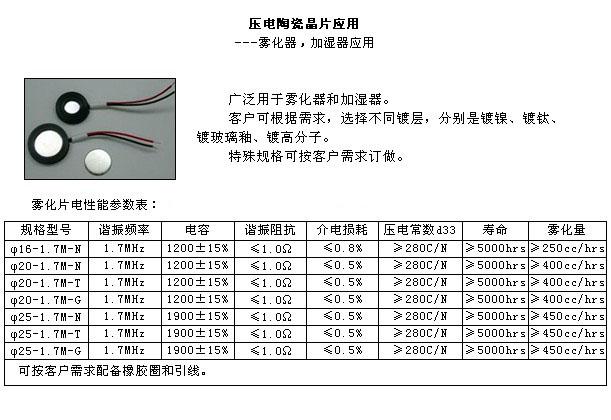 一般情況下我們知道,在正確的使用情況下,陶瓷霧化片的使用壽命約3000小時,且極易更換。公司從2005年開始在中國科學院科學研究院物理研究所、中國納米材料研究所與技術合作與支持下的基礎上歷時一年多經過上百次的的試驗、,不斷完善工藝、檢測設備,并自由開發了一套霧化檢測線,完全滿足客戶的需求進行批量生產,并且保證發給客戶的產品100%的合格,在直徑的一致性和穩定性上可以完全滿足客戶的需求。泰河廠家生產的霧化片具有的特點更是將霧化片的功能發揮到極致,且不說價格能做到同行最低,能提供所有不同片面的霧化片,就已經堪稱是中國最有實力的霧化片廠商了。例如不銹鋼霧化片,鍍鎳霧化片,鍍鈦霧化片,耐酸堿霧化片。它除了高溫度的物理化學性能以外,還具有彈性震動耗損極小,而品質因素可達到百萬這可貴特點。因此他是一種用于頻率穩定和選擇頻率的電子器件,廣泛主要應用于各類醫療微量霧化,USB加濕器,香水霧化器,香薰霧化器。精油霧化器,各類無棉芯加濕器,美容類的各類霧化裝置等產品。霧化片,涉及水霧發生設備領域等產品都需要用到,主要包括壓電陶瓷片和金屬外殼,壓電陶瓷片置于金屬外殼內,壓電陶瓷片下表面設有金屬電極,金屬電極與壓電陶瓷片連接,其特征是在金屬外殼外表面設有保護層。我公司霧化片克服現有技術中的霧化片容易被腐蝕或電蝕的缺點,提供一種耐蝕性強,使用效果好,壽命長的霧化片。