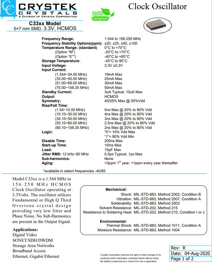 | CE3392-33.333 | CRYSTEK有源振蕩器 | C33 | XO (Standard) | 33.333MHz | ±50ppm | -40°C ~ 85°C |