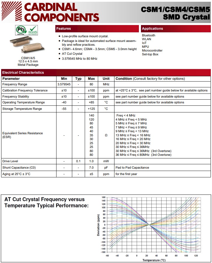 美國Cardinal卡迪納爾晶振CSM系列,CSM1:13x4.7x4.6毫米,CSM4:13x4.7x3.5毫米,CSM5:13x4.7x3.0毫米,是一款SMD石英晶體,兩腳貼片晶振,石英晶振,無源晶振,石英晶體諧振器,無鉛環保晶振,薄型表面貼裝水晶,封裝是自動化表面安裝組裝和回流實踐的理想選擇,CSM1-4.6毫米;CSM4-3.5毫米;CSM5-3.0mm高,AT切割水晶,頻率范圍:3.579545MHz至80MHz。應用于:藍牙,汽車音響控制器,無線局域網,物聯網,微處理器(Microprocessor Unit),微型控制器,機頂盒。汽車音響控制器應用晶振CSM4Z-A2B3C3-40-25.0D18-F
