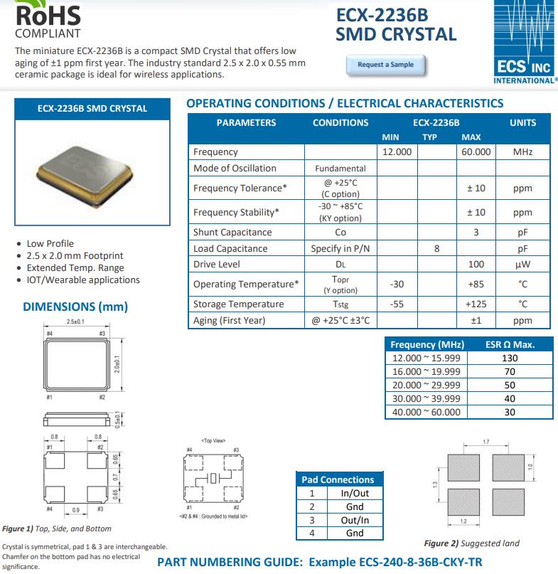 ECS宣布推出微型緊密穩定性、低老化(最大1ppm)晶體ECS-240-8-36B-CKY-TR是射頻應用的理想選擇。微型ECX-2236B是一個緊湊的SMD晶體,提供低第一年老化1ppm。行業標準2.5×2.0×0.55毫米陶瓷封裝,四腳貼片晶振,石英諧振器,非常適合無線應用。