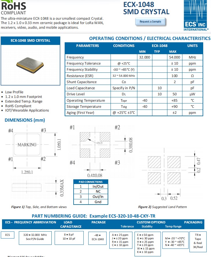 ECS的超微型ECX-1048晶振,小體積晶振尺寸1.2x1.0x0.33mm四腳貼片晶振,無(wú)源晶振,石英晶體諧振器,陶瓷封裝,ECS-240-8-48-CKY-TR緊湊型晶體非常適合LoRa WAN應(yīng)用, 接收器、視頻,可穿戴設(shè)備,音頻和移動(dòng)通訊等應(yīng)用。