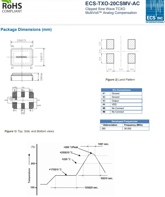 ECS晶振ECS-TXO-20CSMV-AC是一款模擬補償削波正弦波 MultiVolt TM TCXO溫補晶體振蕩器,可為精密應用提供超緊密的穩定性。小體積晶振尺寸2.0x1.6x0.8mm封裝,六腳貼片晶振,頻率范圍10MHz至52MHz,溫度補償晶體振蕩器在1.7V至3.6V的多電壓能力和1.8V、2.5V、3.0V的靜態電源下,在 -30°C至+85°C提供 ±0.5ppm的超嚴密穩定性選項,和3.3V。ECS-TXO-20CSMV-AC貼片晶振使用高刷新率或頻率校準率,在溫度補償期間保持線性頻率輸出。該產品具有低電源電壓,低抖動,低功耗,低損耗,低耗能,低電平,低相位噪聲等特點,適用于全球定位系統,WiMAX,無線局域網、可穿戴設備,Wi-Fi和物聯網應用。