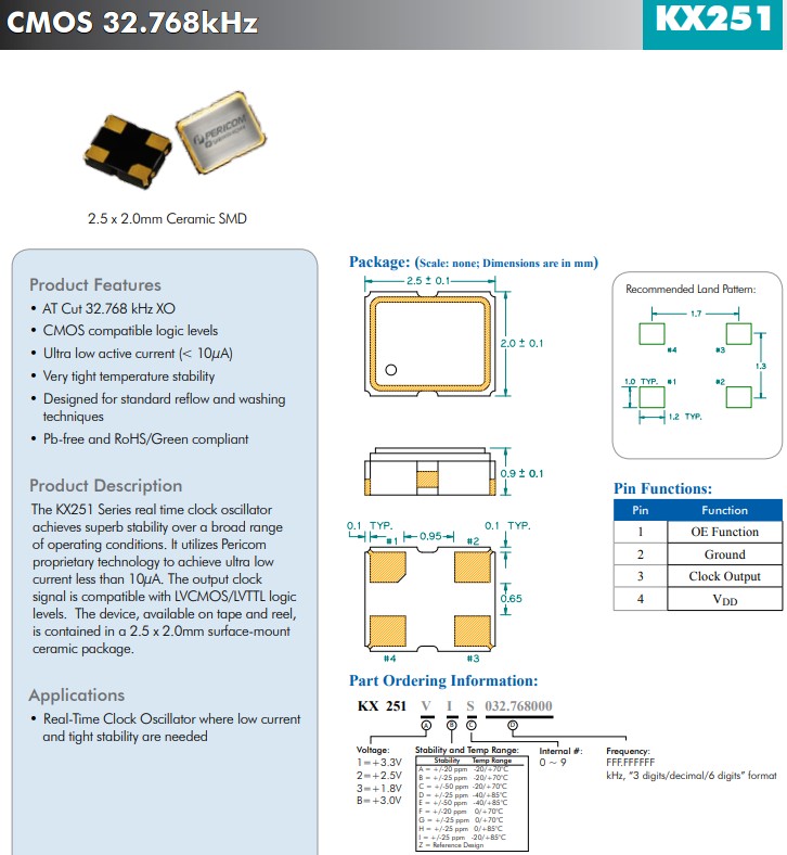 百利通亞陶晶振KX251系列,編碼KX2513G0032.768000,是一款實時時鐘晶體振蕩器,在廣泛的工作條件下實現了卓越的穩定性,電源電壓1.8V/2.5V/3.3V,頻率:32.768kHz,CMOS晶體振蕩器,它利用 Pericom專有技術實現小于10μA的超低電流。輸出時鐘信號與 LVCMOS/LVTTL邏輯電平兼容。該器件采用卷帶包裝,小體積晶振尺寸采用2.5x2.0mm表面貼裝陶瓷封裝。
