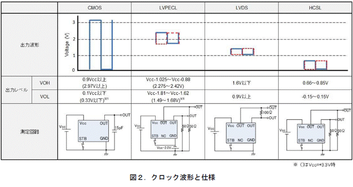 以下的差分晶振即使受到GND噪聲的影響,在輸出的末端被取消時,作為沒有噪聲的信號所展示的樣子,以及單輸出振蕩器受到噪聲影響的樣子. 這樣,通過使用差分晶振,可以防止噪聲的影響.