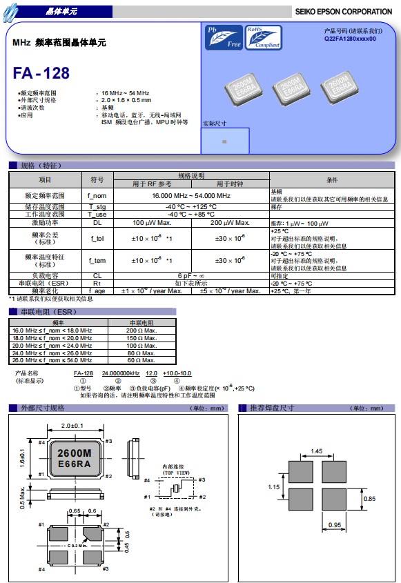 愛普生晶振FA-128是一款超小型尺寸2.0x1.6mm石英晶體諧振器,無源晶振,四腳貼片晶振,頻率范圍:16MHz至54MHz,具有超小型,輕薄型,穩定性好,耐熱及耐環境特點,該款FA-128小體積晶振可以在-40℃至+85℃的溫度內穩定工作,被廣泛應用于小型便捷式通信設備、攜帶設備,智能手機、無線藍牙,平板電腦、數碼相機、智能家居,平板電腦、計量儀表、汽車電子、工業控制系統等。