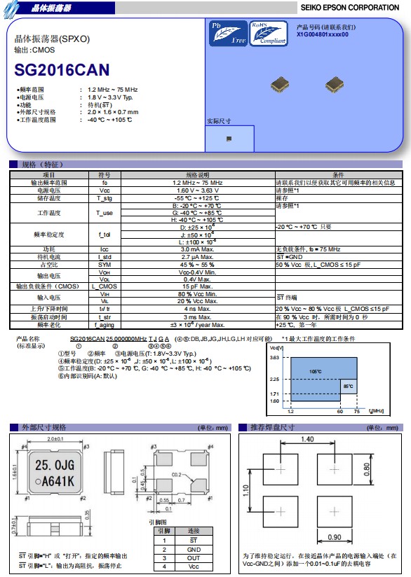 愛普生晶振SG2016CAN,是一款帶CMOS輸出的簡單封裝晶體振蕩器(SPXO)系列,小體積晶振尺寸2.0x1.6mm,四腳貼片晶振,有源晶振,石英晶體振蕩器,頻率范圍1.2MHz至75MHz,1.8V至3.3V的寬工作電壓和寬工作溫度范圍從-40°C到105°C。這些SPXO具有低電流消耗,高穩定性、超小型,輕薄型、低功耗,低抖動,寬溫等優勢。 這些SPXO非常適合移動通訊,智能手機,物聯網、可穿戴設備、醫療、工業自動化等各種應用。
