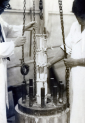 這張照片展示了20世紀(jì)50年代末到60年代初高壓滅菌器開發(fā)的典型場(chǎng)景。在這里,技術(shù)人員正在推出使用新創(chuàng)建的高壓滅菌器生產(chǎn)的人造石英原型。
