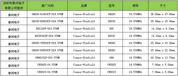 康納溫菲爾德集團生產的有源晶體大致分為SMD型和插件型,SMD晶振的封裝比較小,而插件型的體積比較大,被稱為鐘振。24.576MHz是石英晶體振蕩器系列里,最常用到的一個頻點,康納溫菲爾德公司擁有許多條24.576M的晶振編碼。