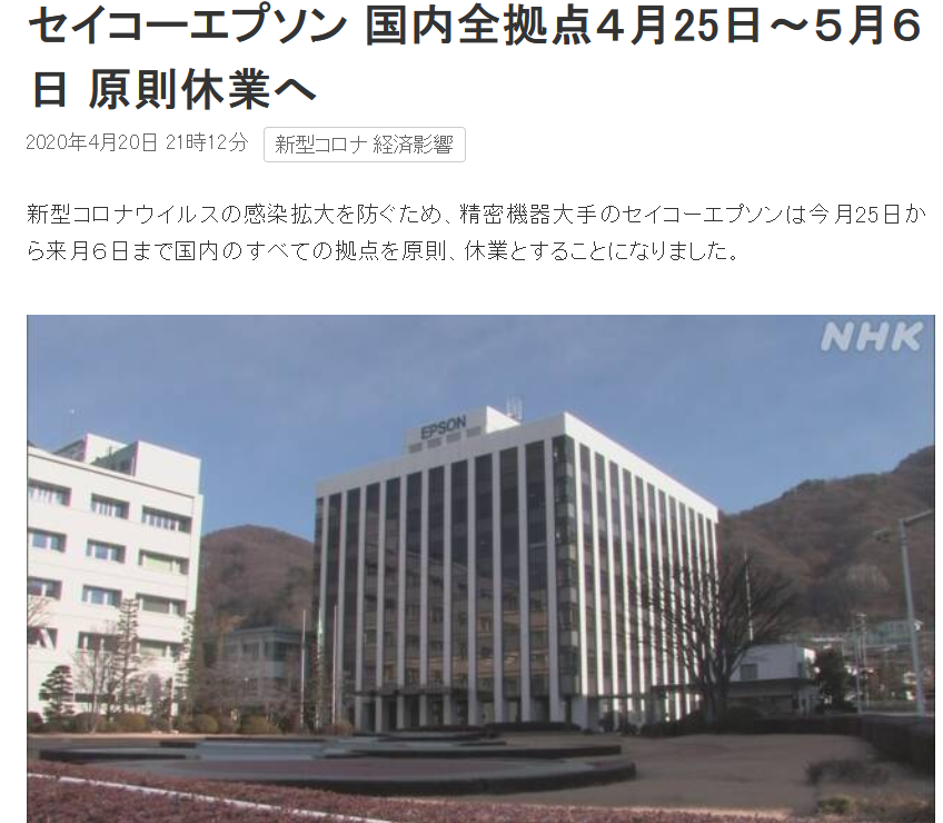 セイコーエプソン株式會(huì)社(以下エプソン)は、日本政府による「緊急事態(tài)宣言」の全國(guó)拡大を受け、エプソングループの國(guó)內(nèi)拠點(diǎn)を4月25日(土)から5月6日(水)まで休業(yè)することとしました。