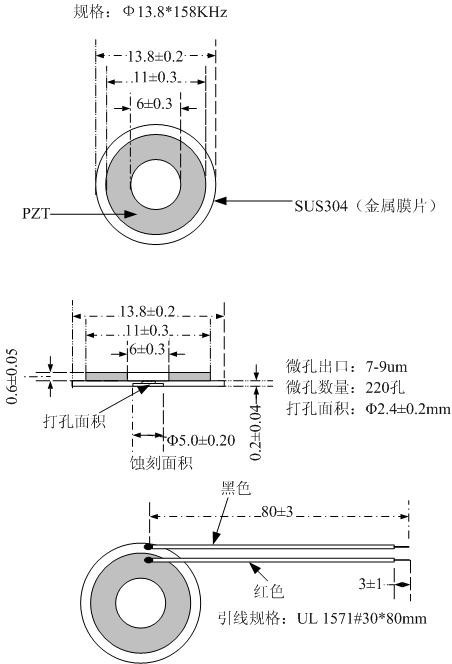 • 產品應用: 1.應用此規格超聲波霧化片主要應用在微量霧化設備中。2.型號TH-13.8mm-158K3.規格說明3.1外形圖3.2電氣參數3.2.1諧振頻率(fr)fr=158kHz5kHz3.2.2諧振阻抗(Ro)Ro=max.1803.2.3靜態電容(Cp)Cp=1300pF15%4、測試方法4.1....