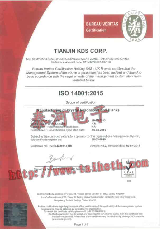 日本大真空晶振天津工廠自2013年3月9日獲得歐盟認證ISO14001:2015認證體系.保證所生產所有KDS石英晶振均符合國際ROHS標準.