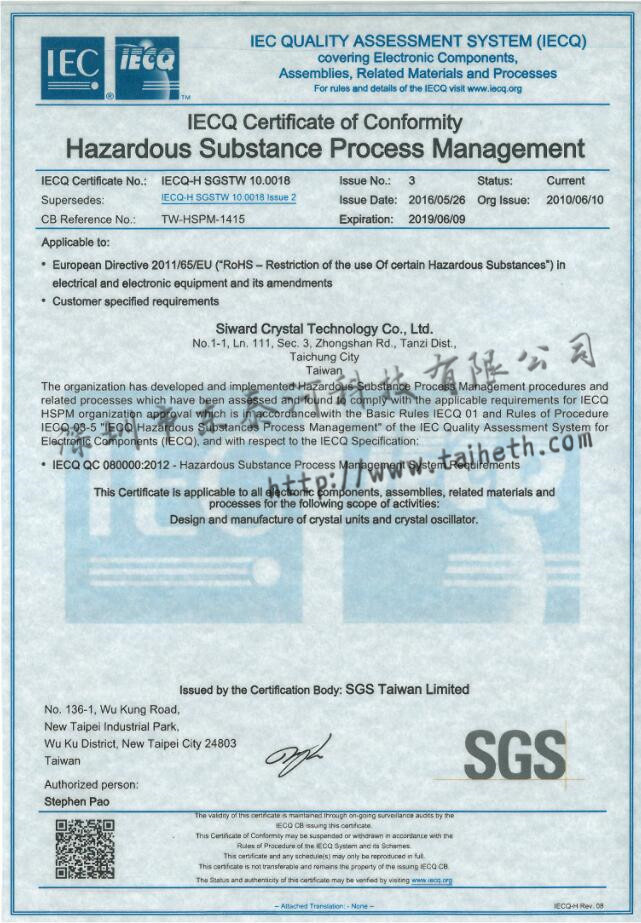 •IECQ QC 080000:2012 - 有害物質過程管理系統要求本證書適用于以下活動范圍的所有電子元件,組件,相關材料和工藝:晶體單元和石英晶體振蕩器的設計和制造。