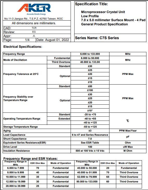 C7S-64.000-32-2030-3-X-R|64MHz|32pF|AKER品牌規格表