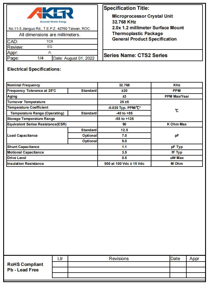 CTS2-32.768-12.5-20-X-R|32.768KHz|12.5pF|AKER晶振規格表